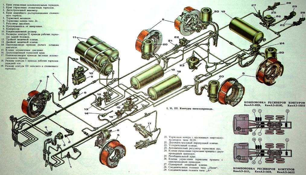 Принцип работы тормозной системы КамАЗ основан на использовании сжатого воздуха. При нажатии на педаль тормоза‚ открывается тормозной кран‚ который направляет сжатый воздух из ресиверов в тормозные камеры. Тормозные камеры‚ в свою очередь‚ воздействуют на тормозные механизмы‚ прижимая тормозные колодки к барабанам (или дискам) и замедляя вращение колес. Когда педаль тормоза отпускается‚ воздух из тормозных камер выпускается‚ и тормозные механизмы возвращаются в исходное положение.