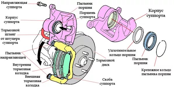- Тормозной суппорт: Содержит поршни, которые прижимают колодки к диску.